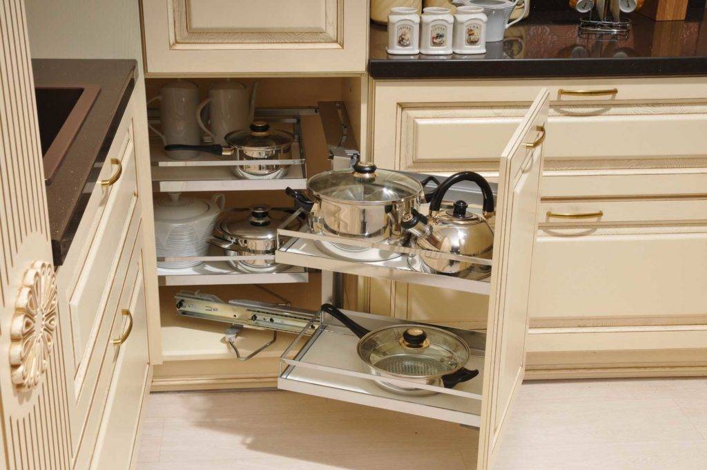 Кастрюли располагают в нижнем ярусе кухонного гарнитура. Для хранения кухонного инвентаря применяют стационарные и выдвижные полки, глубокие ящики. Для оснащения углового модуля лучше выбрать поворотную карусель либо выдвижную систему «волшебный уголок».
