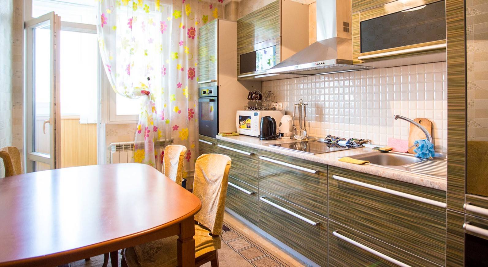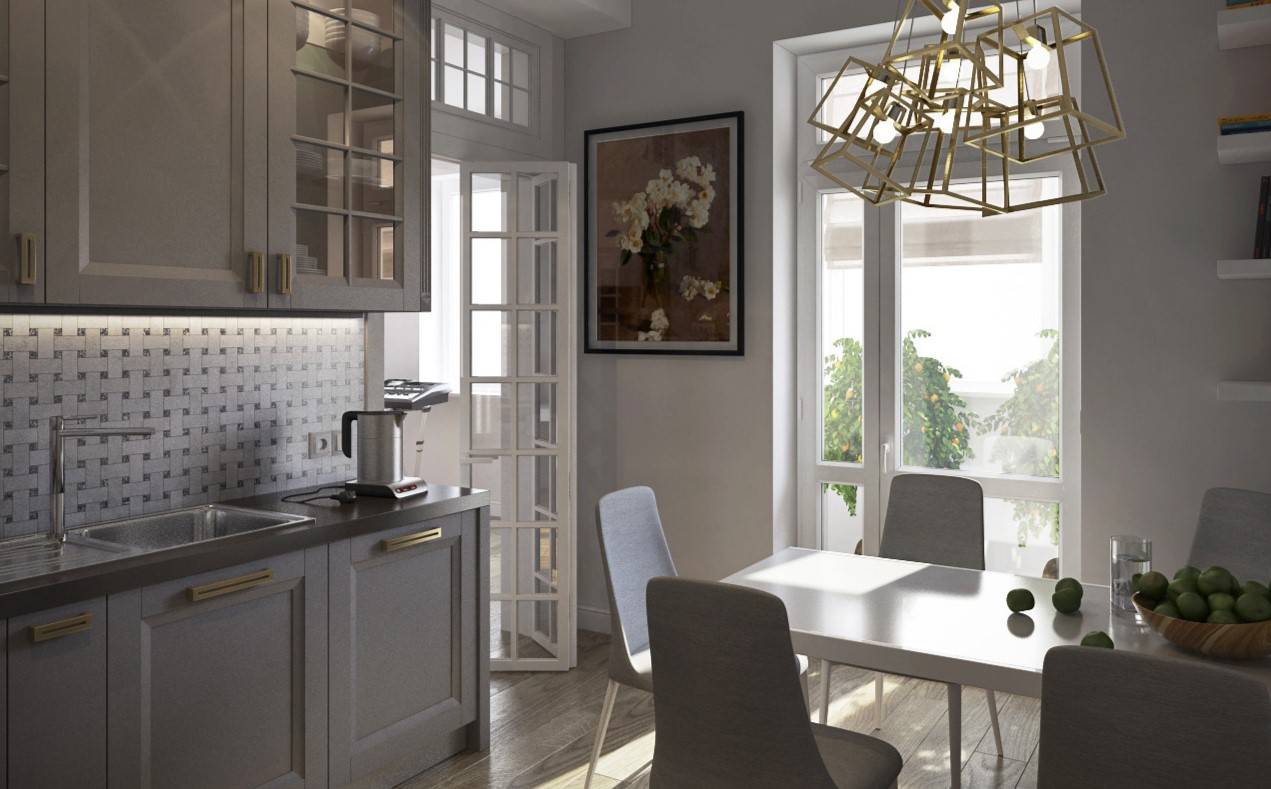 В некоторых современных кухнях есть выход на балкон. Расширив кухню за счет лоджии или балкона, получаем дополнительную площадь, где можно оборудовать обеденную зону.