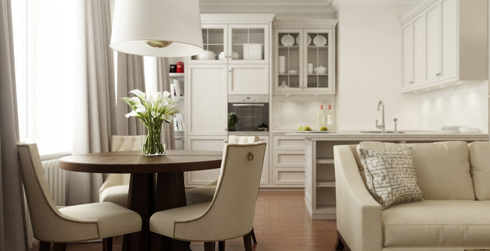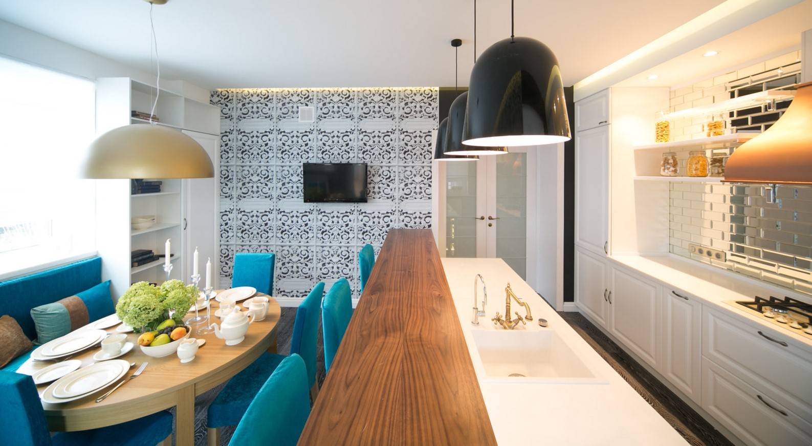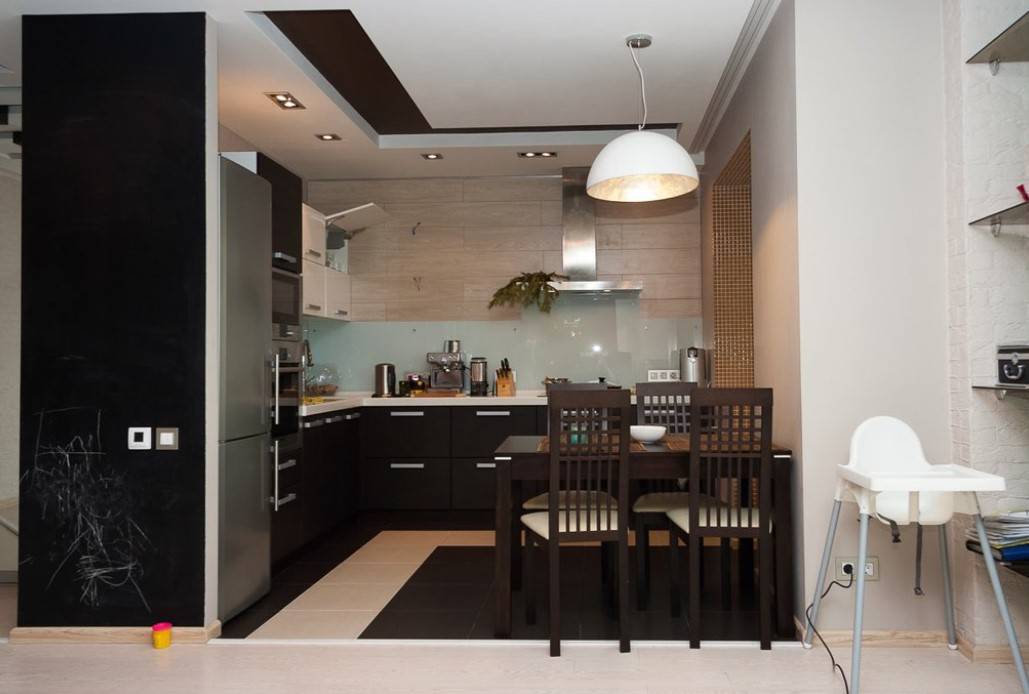 Оформление интерьера кухни, совещенной с гостиной