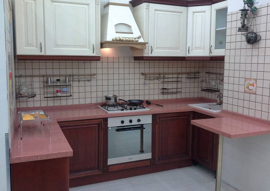 Выбирайте столешницу и мойку из искусственного камня светлого спокойного оттенка (темные зрительно уменьшат объем кухни). Такого же цвета или сочетающегося по оттенку подберите и настенную плитку для фартука. Спокойная пастельная палитра – это настоящая классика: она всегда выглядит достойно и гармонично.