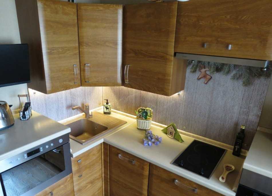 Над шкафами напольными разместите два навесных шкафчика со стеклянными фасадами. Стекло привносит в небольшое помещение кухни дополнительный отраженный свет. Объединяющим элементом двух линий гарнитура, как правило, является навесной угловой шкаф.