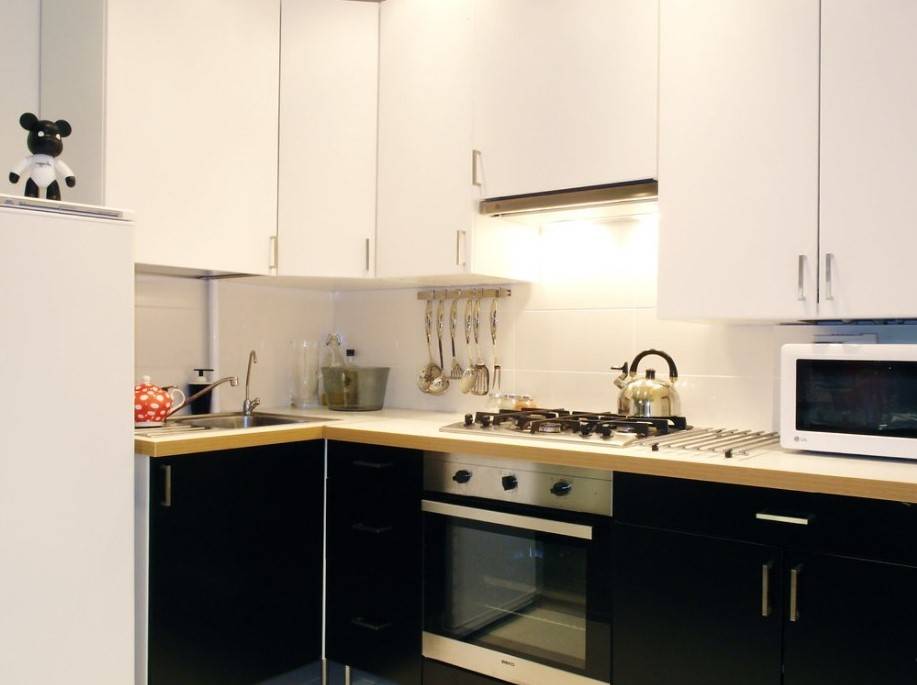 Черное-белое оформление интерьера маленькой кухни