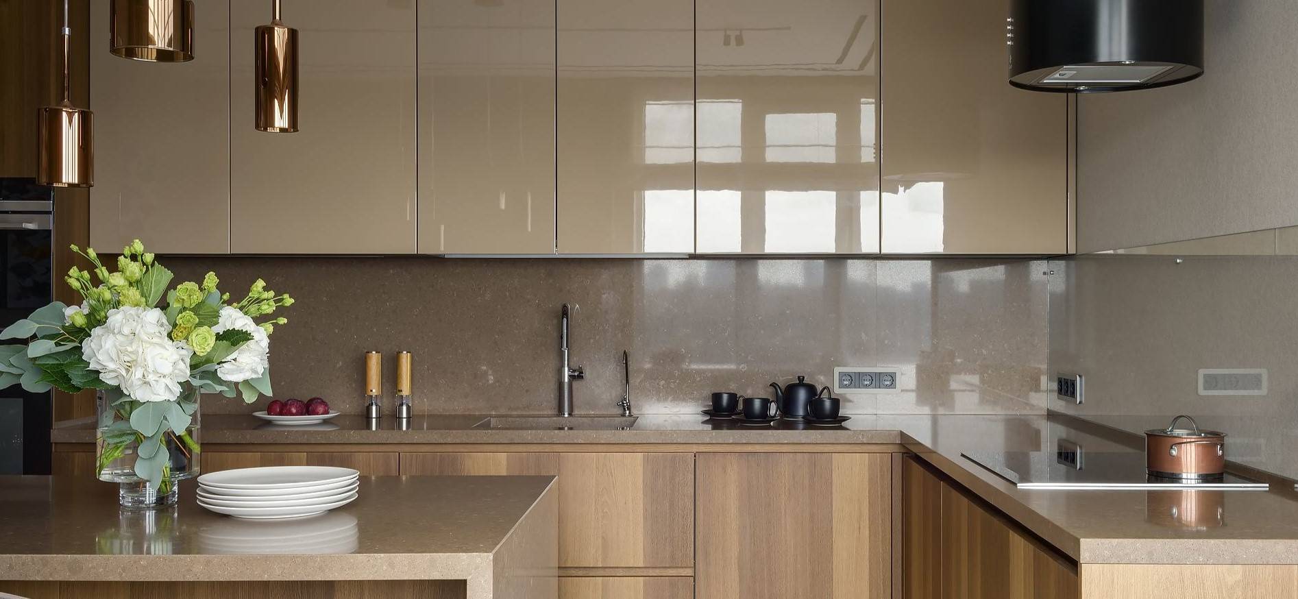 Стильные золотые светильники можно разместить над рабочей поверхностью