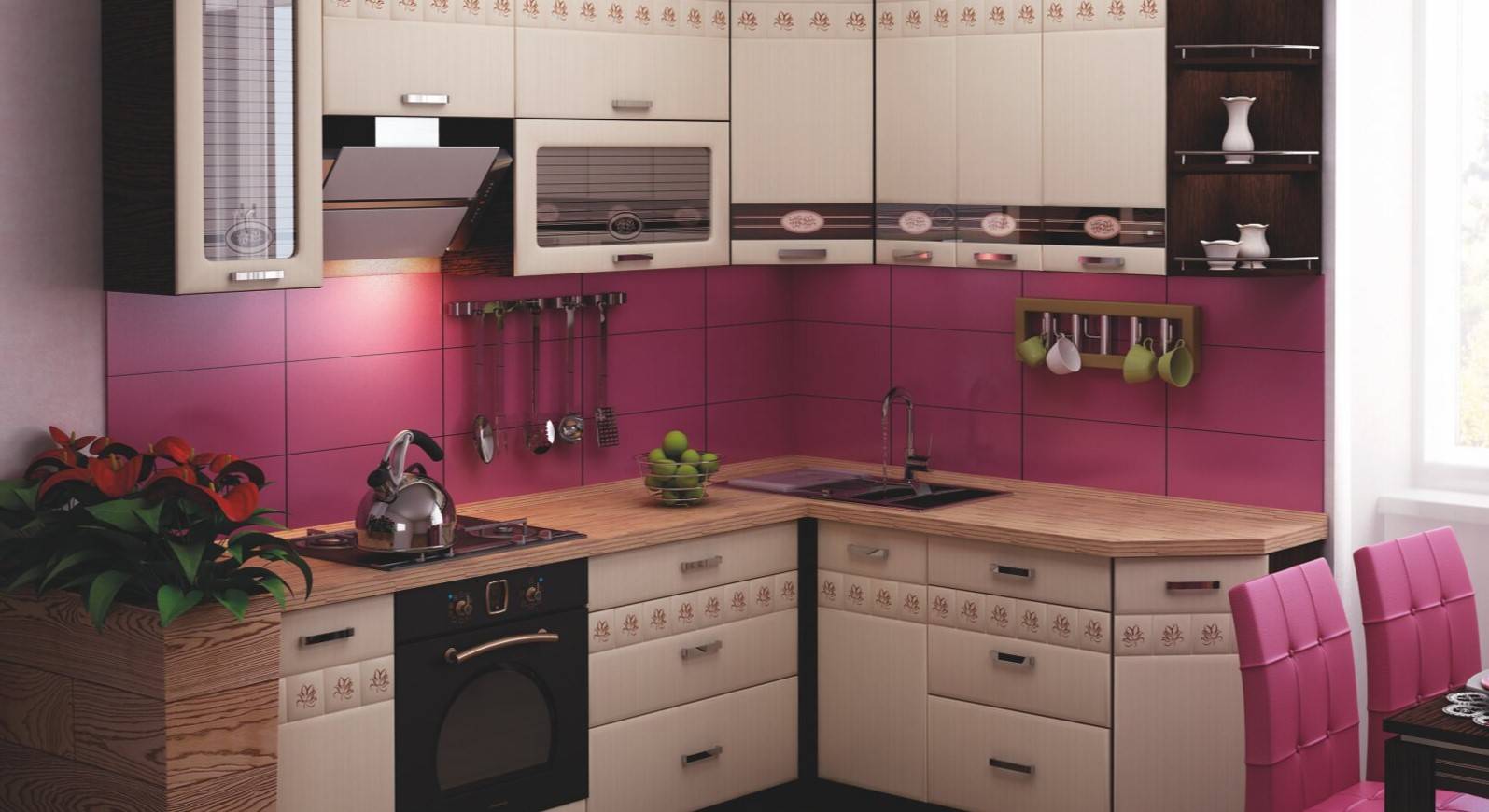 Конечно, свои ограничение на цвет кухни накладывает и выбранный стиль. Например, невозможно встретить классический гарнитур в цвете фуксия. Но и небольшая площадь тоже несколько ограничивает цветовой выбор. К примеру, лучше избегать обилия темного дерева, которым как раз и славится та же классика.