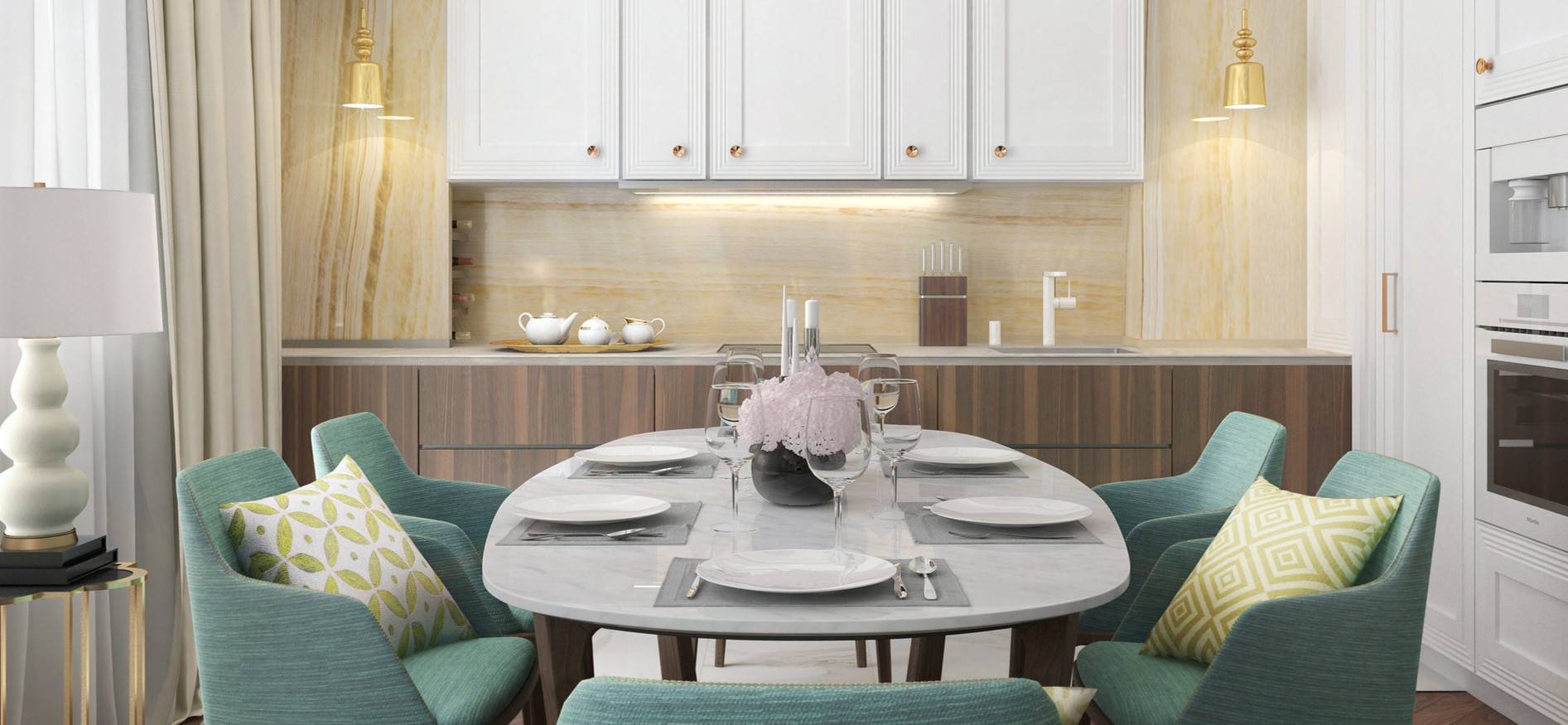 Стильный золотой светильник прекрасно подходит под стиль интерьера кухни
