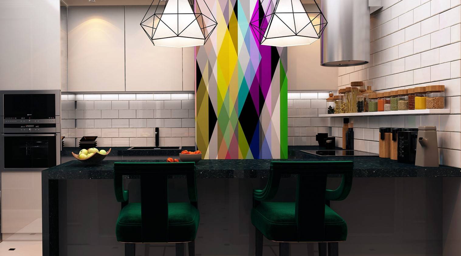 Два подвесных светильника белого цвета идеально дополняют современный интерьер кухни
