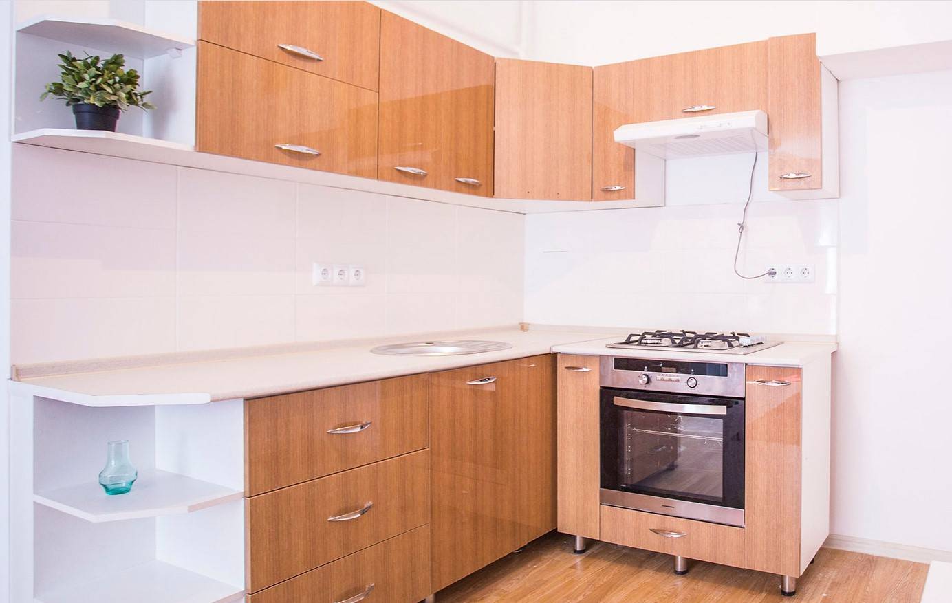 Наверху хорошо размещаются несколько шкафчиков со стеклянными и глухими фасадами, над газовой плитой устанавливается вытяжка.