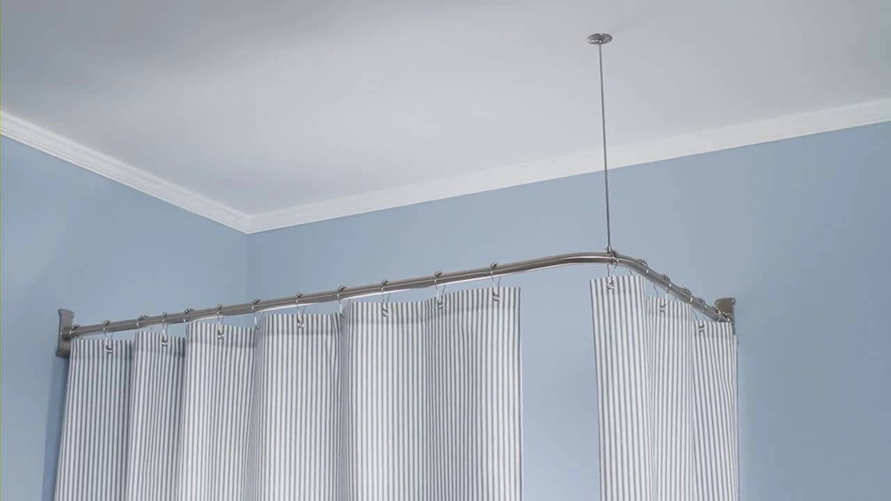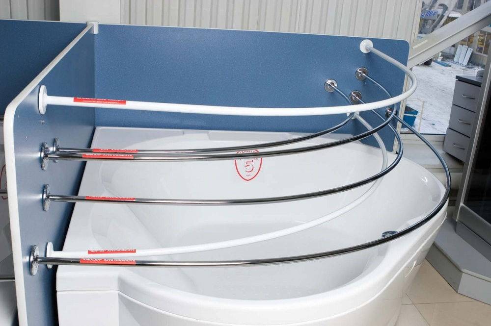 Самыми распространенными являются штанги углового, полукруглого и изогнутого типа с разным принципом установки на стенах, что помогает подобрать оптимальный вариант в зависимости от размеров и расположения душевого поддона в ванной комнате.