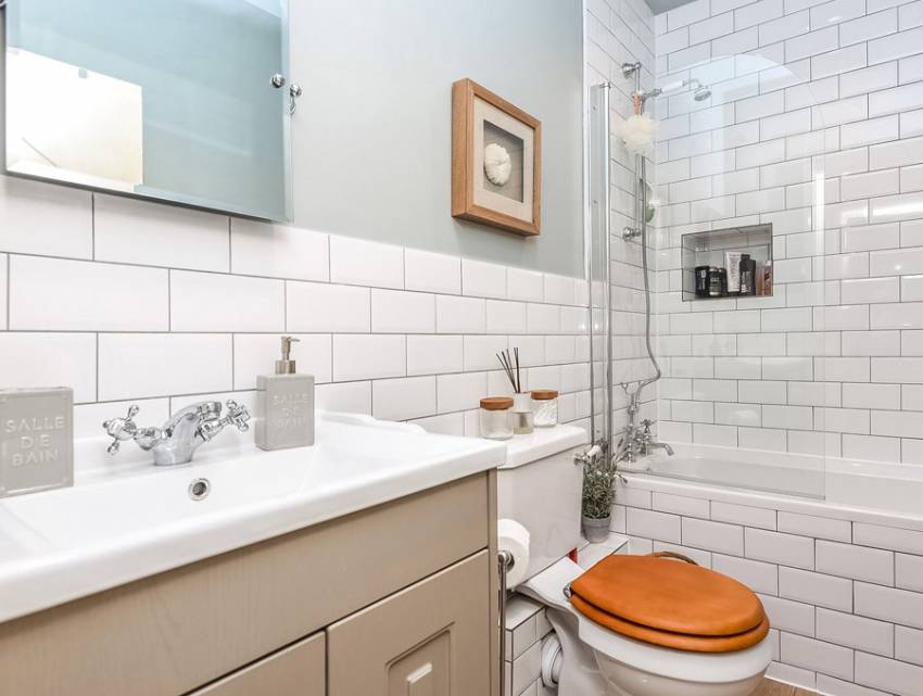 На фото интерьер ванной и маленькая душевая с белой плиткой, украшенной рисунками.