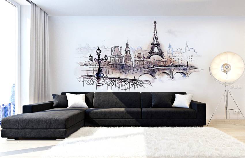 На стенах можно повесить одну-две картины, желательно в черно-белом цвете.