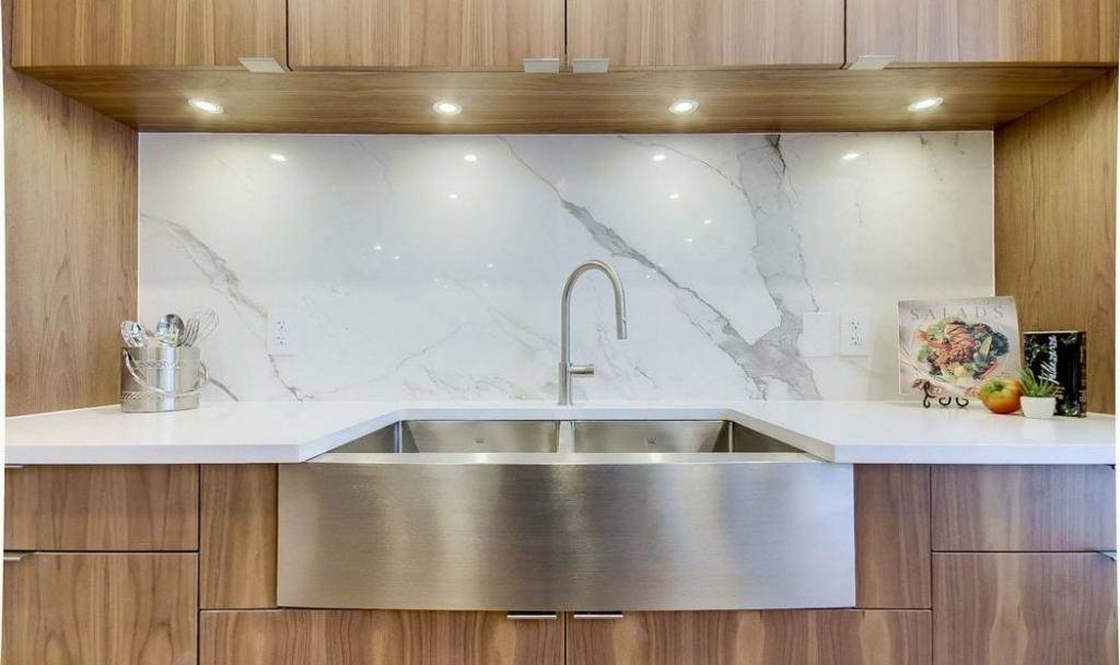 Чтобы определиться с размерами, следует учитывать габариты гарнитура. Как правило, закрывается вся стена между верхним и нижним ярусом кухни. Если предусмотрена угловая мойка, то разумно будет защитить ее с двух сторон (и пристенок тоже), чтобы вода не попадала на покрытие.