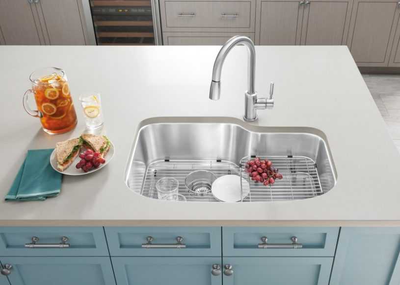 Так как кухонная раковина устанавливается в столешницу шкафа, она не может быть больше ее по размерам. Учтите, что найти варианты в шкафы небольшой глубины — менее 60 см — очень сложно. Разве что раковина будет только с бортиком и для накладного монтажа.