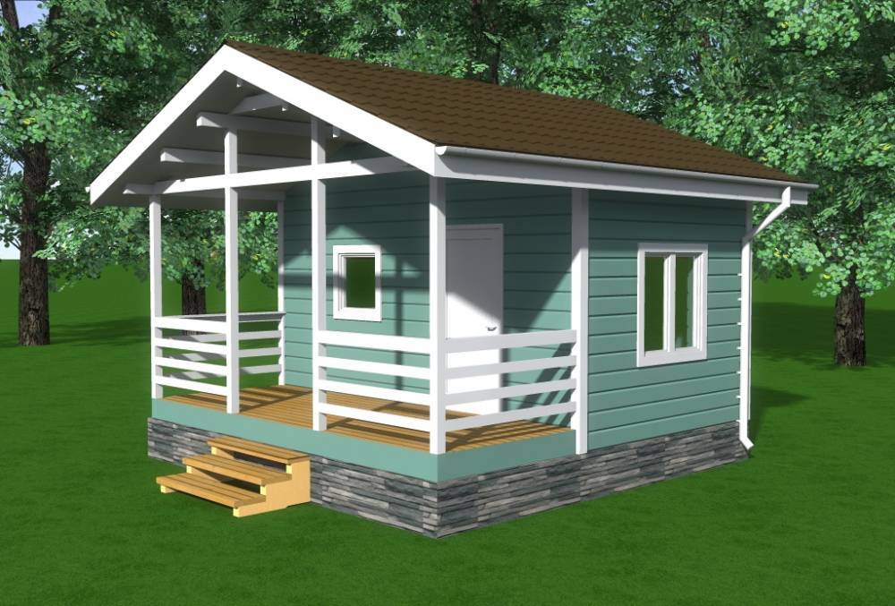 Каркасная баня может быть оборудована террасой для посиделок в теплое время года