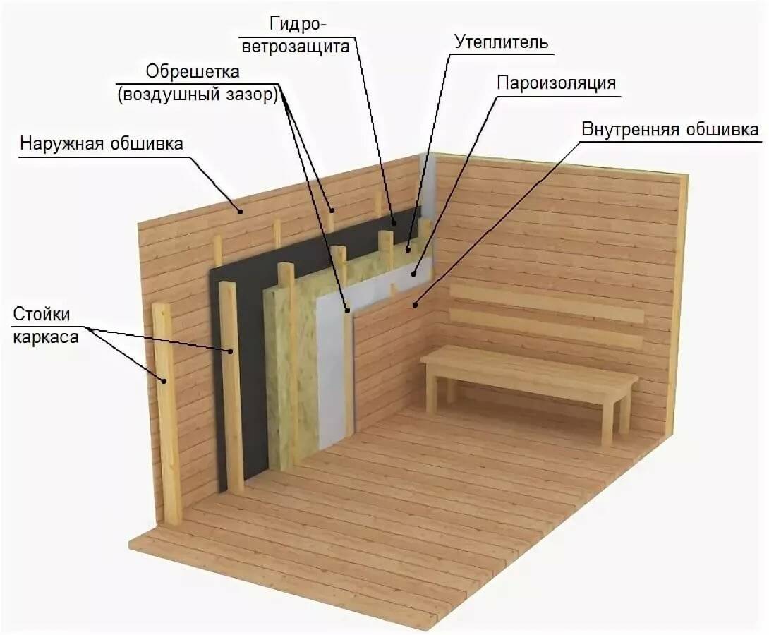 Теплосбережение каркасной бани является ее сильной стороной. Толщина стен — это, по сути, толщина утеплителя, составляющего весь объем полостей каркаса.