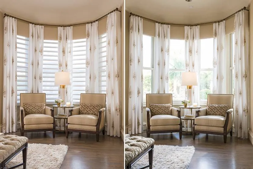 Эркерные шторы в бежевом цвете на окне в гостинойИсточник sunriseblinds.net