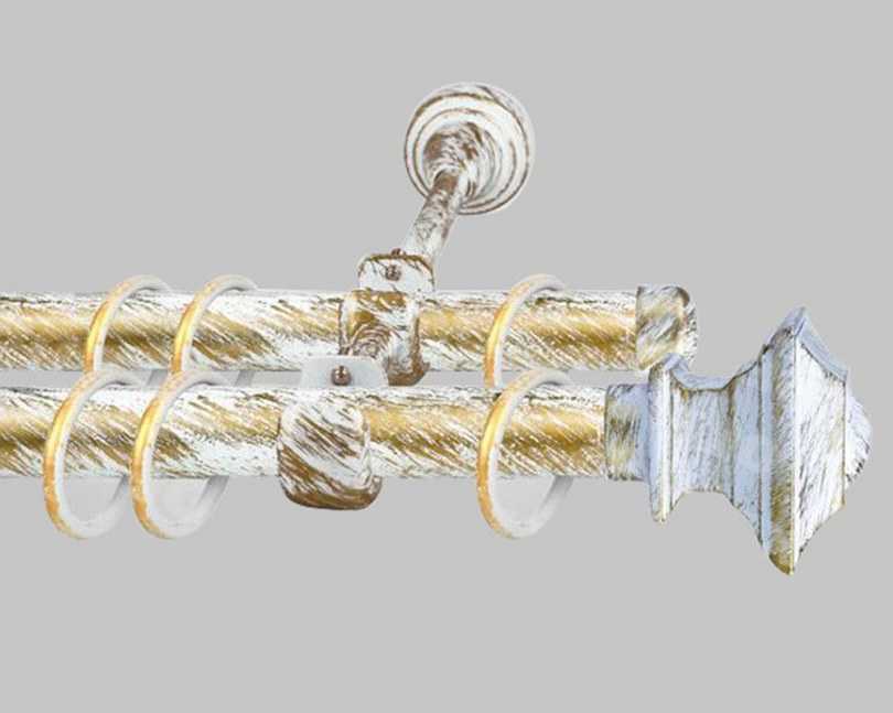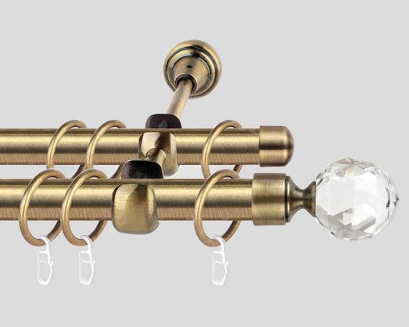 Конструкция с двумя штангами может дополнить классический стиль или более сдержанный, в котором приветствуются простые линии. В зависимости от этого металлический карниз может быть хромированным или с имитацией текстуры дерева. Алюминий, из которого он изготовлен, рассчитан на удерживание плотных портьер с большим весом.