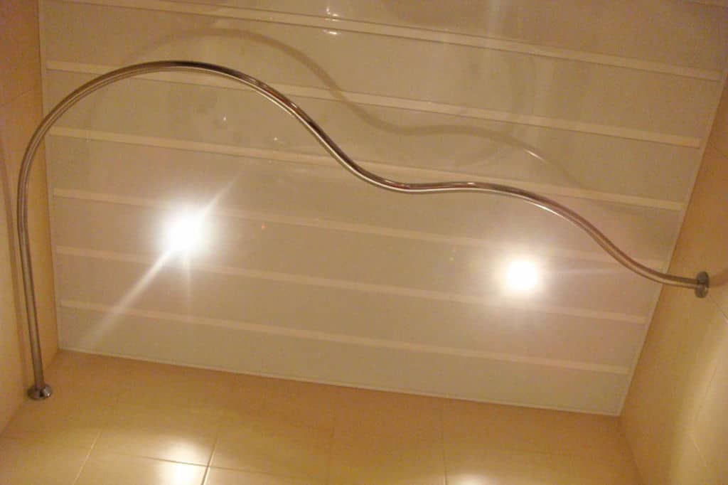 Если резервуары асимметричные и установлены в углу или нише, лучше использовать карнизы в форме дуги, когда изогнутую трубку фиксируют на смежной либо противоположной поверхности. При креплении подобных конструкций к потолку потребуется предусмотреть дополнительную опору у стены.