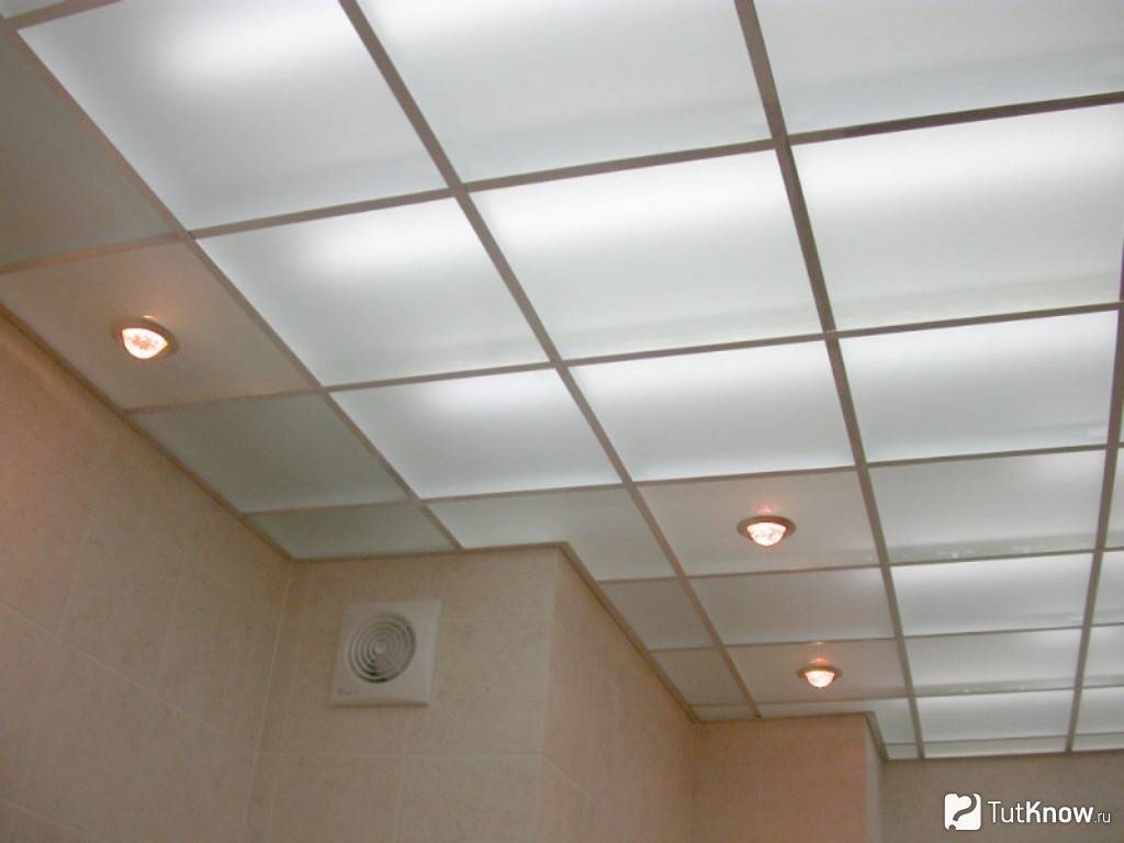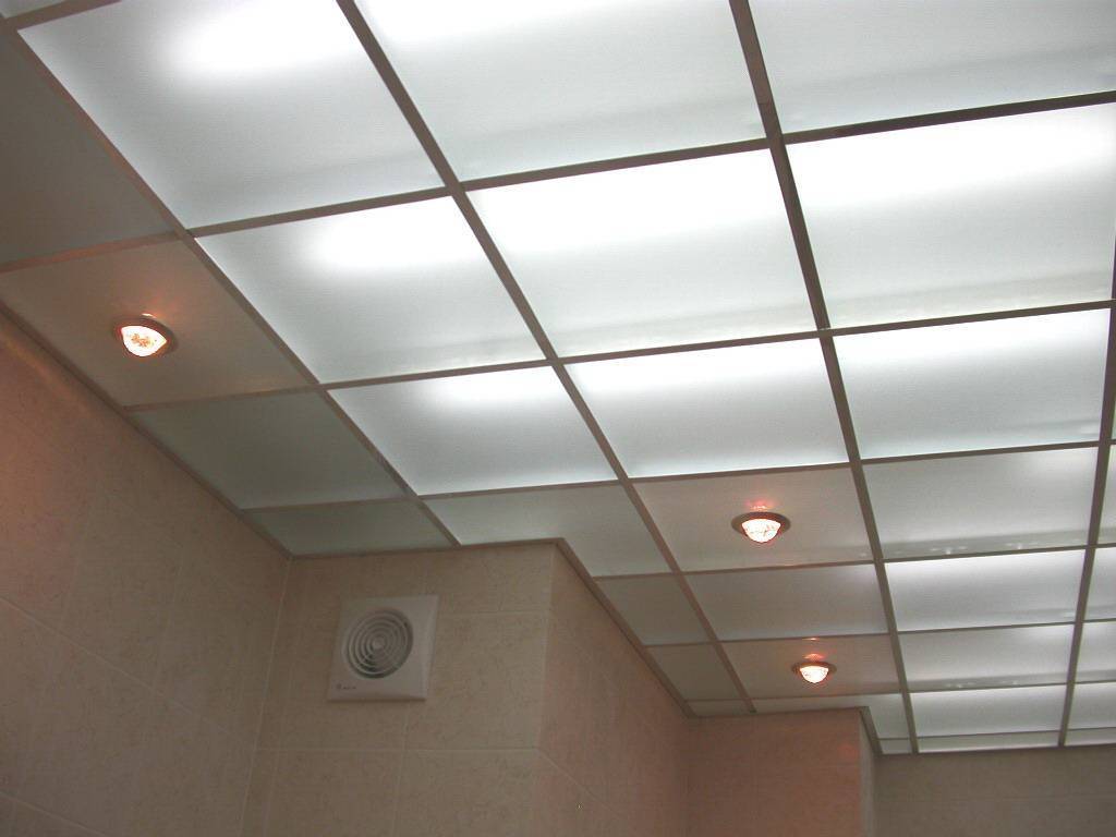 - Кассеты потолков, изготовленные из стекла или алюминия, влагоустойчивы, им не страшны грибки и плесень. Поэтому потолки из таких элементов можно устанавливать в душевых, ванных комнатах и бассейнах.
