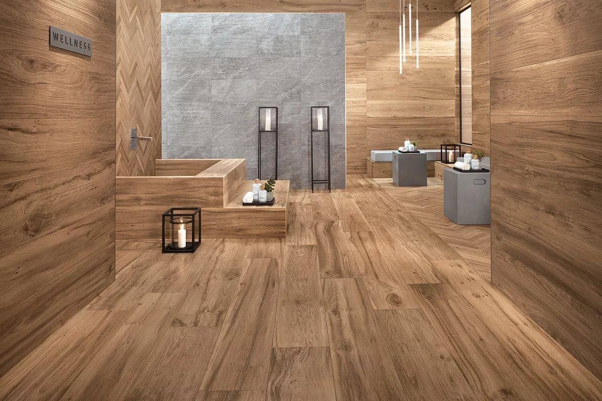 Настенная плитка, имитирующая древесный принт, фактуру и теснение, благодаря легкому уходу и красивому внешнему виду, прекрасно подходит для реализации самых разнообразных дизайнерских идей.