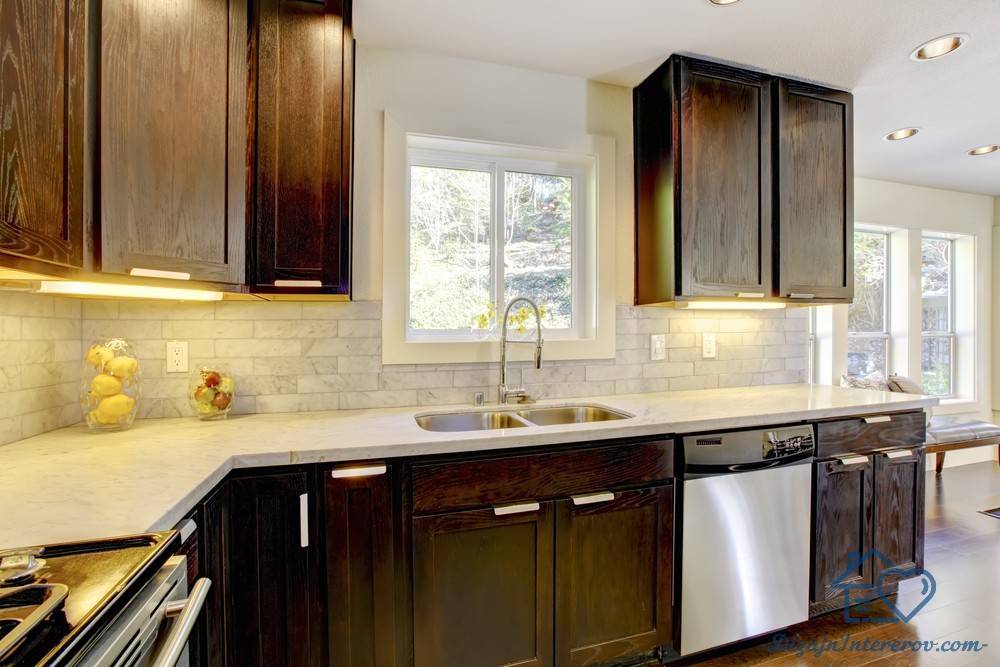 Часто используют кладку насыщенного коричневого цвета. Это хорошее решение для кухонного помещения с большим количеством естественного света.