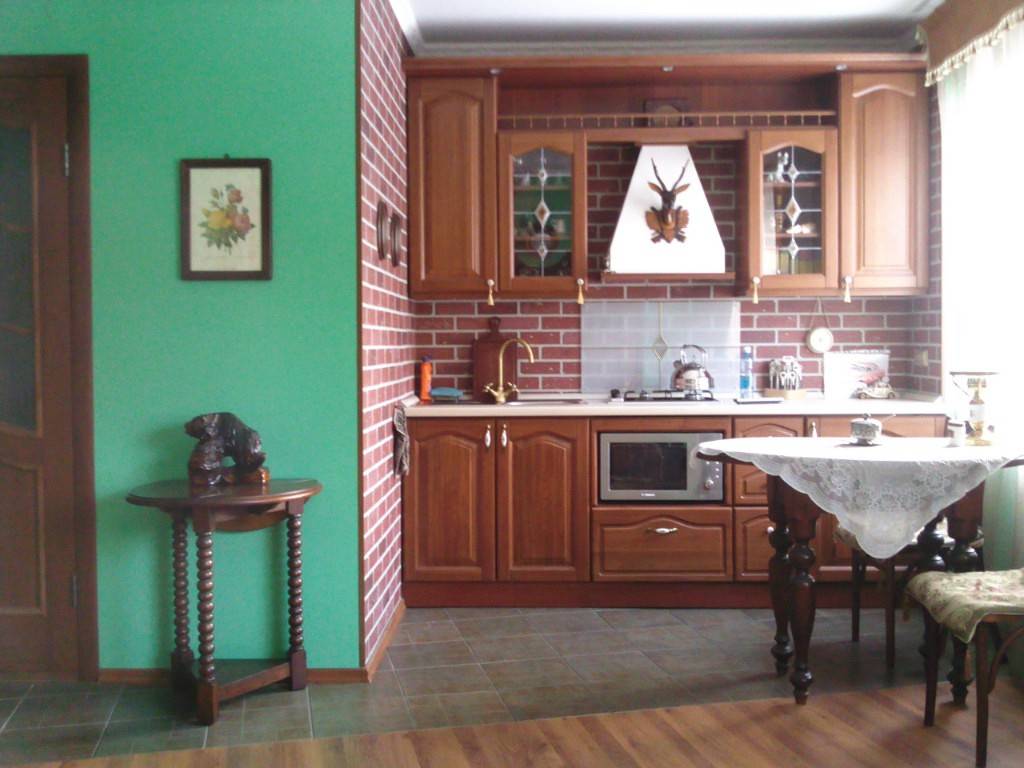 Оформление одной из стен. Не рекомендуется выполнять отделку с использованием кирпичного рисунка сразу нескольких стен. В просторных кухнях с хорошим освещением вариант повторения дизайна двух стен в некоторых случаях смотрится хорошо.
