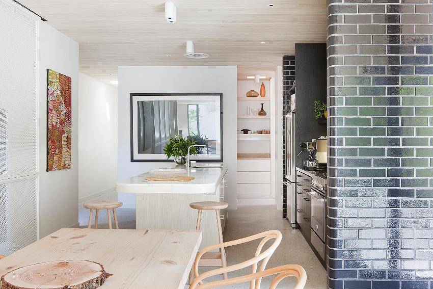 Чёрный виниловый пол формирует индустриальный характер этой кухни наряду с кирпичными стенами, проект Bennett Frank McCarthy Architects