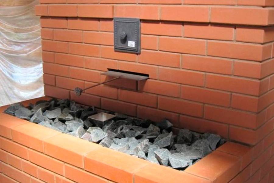 Кирпичная печь для бани с закрытой каменкой оборудована окошком для подачи воды на поверхность камней. Для более быстрого нагрева помещения дверцу можно открыть.