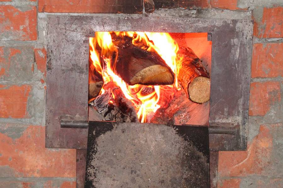 Основание кладки выполняют в косую штриховку из простого красного кирпича, на цементно-песчаный раствор. Эта часть находится под топкой и не будет испытывать высоких тепловых нагрузок. Топочную часть выкладывают из красного керамического кирпича, в сочетании с огнеупорным (шамотным) материалом. В качестве раствора используют глиняную смесь с песком (иногда с добавлением шамота).