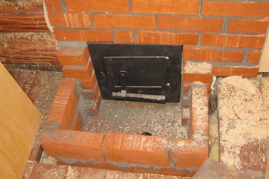 После окончания кладки стен монтируют массивные металлические дверцы для камер, используя поворотные крепежи на стыках.