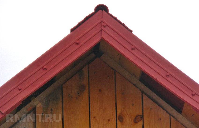 Чтобы герметизировать кровлю и скрыть торцы монтажных элементов, используется ветровая планка. Детали закрепляются шестью крепежными элементами внахлест по замку. Начинают монтаж с нижней точки, затем поднимаются вверх до конца накрываемого элемента. Одно крыло закрепляется на торцевой стропильной балке, а второе — на кровельных листах. Шаг крепежа соответствует шагу обрешетки.