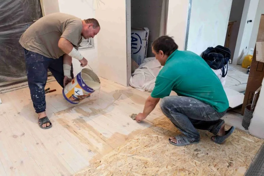 - Для крепления фанеры вам потребуется напарник, ведь эту работу точно не выполнить одному. Нанесите клей на поверхность пола и гребёнкой удалите излишки.