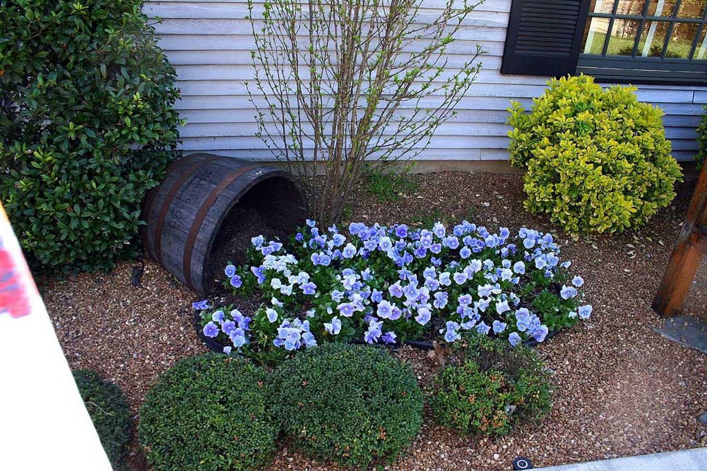 Выбирают подходящее возвышение и слегка раскапывают его вершину. Укладывают бочку или ведро на бок и хорошенько прикапывают, чтобы емкость не сдвигалась. Внутри выстилают дно мульчирующей пленкой и насыпают грунт. Склон, расположенный у отверстия бочки, тщательно рыхлят, очищают от сорняков и тоже присыпают цветочным грунтом. Когда земля уляжется, можно высаживать низкорослые цветы.