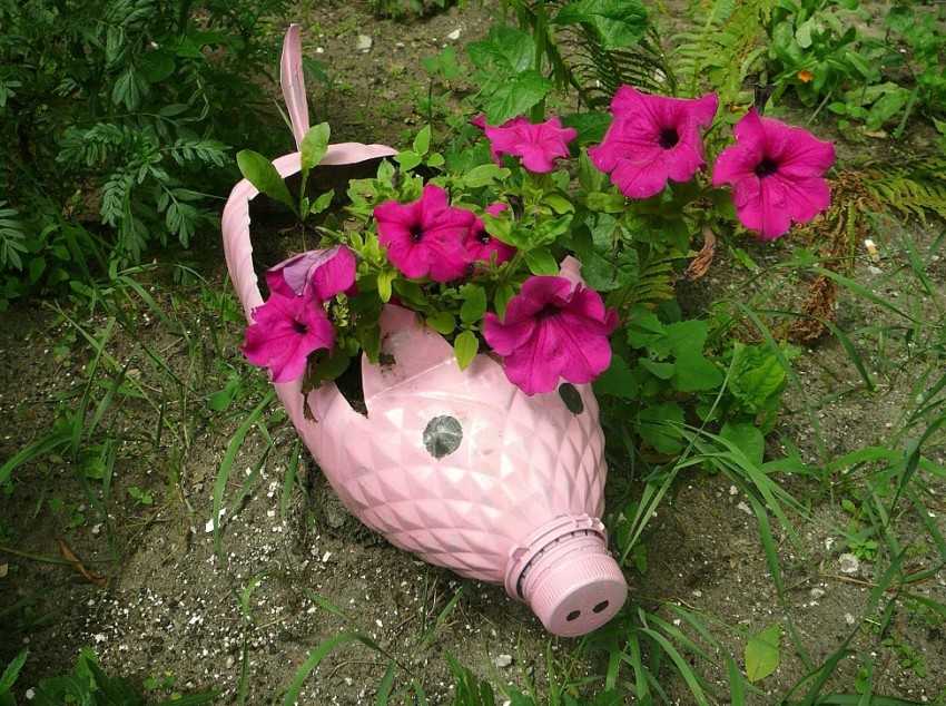 Такие оригинальные цветники являются хорошим решением для холмистых участков. Для создания композиции подходит практически любая емкость удлиненной формы. Это может быть пластиковая и деревянная бочка, алюминиевый бидон, ведра разных размеров. Причем емкость подходит даже с повреждениями, ведь видимой остается только одна сторона.
