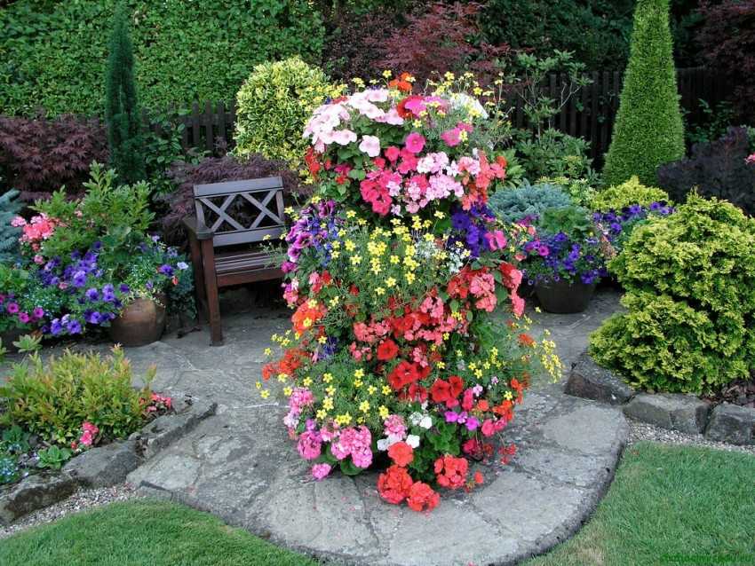 Красиво смотрятся петунии в таком цветнике, а также разноцветные фиалки и мелкие гвоздики. Можно использовать старую ненужную тачку: ее устанавливают с одной стороны холма, немного наклоняют так, чтобы нижний край опирался на вершину, и укрепляют подручными средствами. Затем наполняют тачку землей, а заодно и подготавливают почву на холмике. Высаживают растения по всей поверхности возвышения и в самой тачке, цветы лучше использовать яркие и разноцветные.