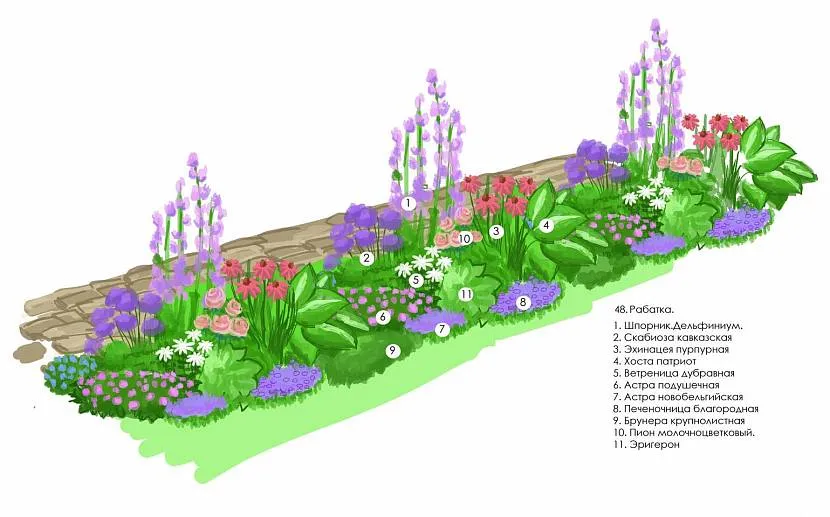 Примерная схема размещения растений в миксобордере вдоль дорожки