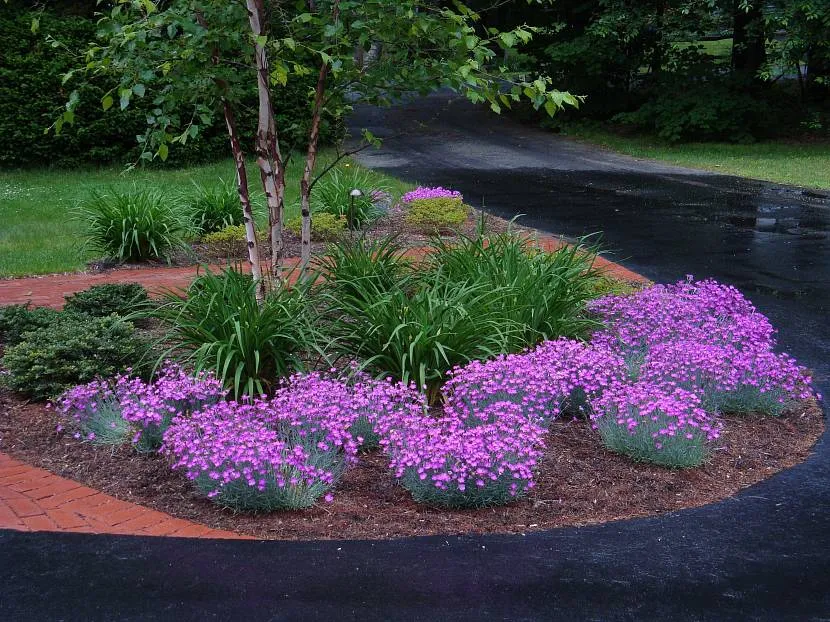 Чтобы такой цветник выглядел объемно и привлекал внимание, у переднего края высадите низкорослые, долго цветущие гвоздики. В середине можно расположить нецветущие многолетники