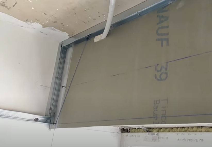 Обшивание листами – этап, после которого доступ к основному потолку будет затруднен, поэтому при необходимости в пространство укладываются теплоизоляционные материалы, гидроизоляция, заделываются обнаруженные дефекты базового основания и прочие мелочи.