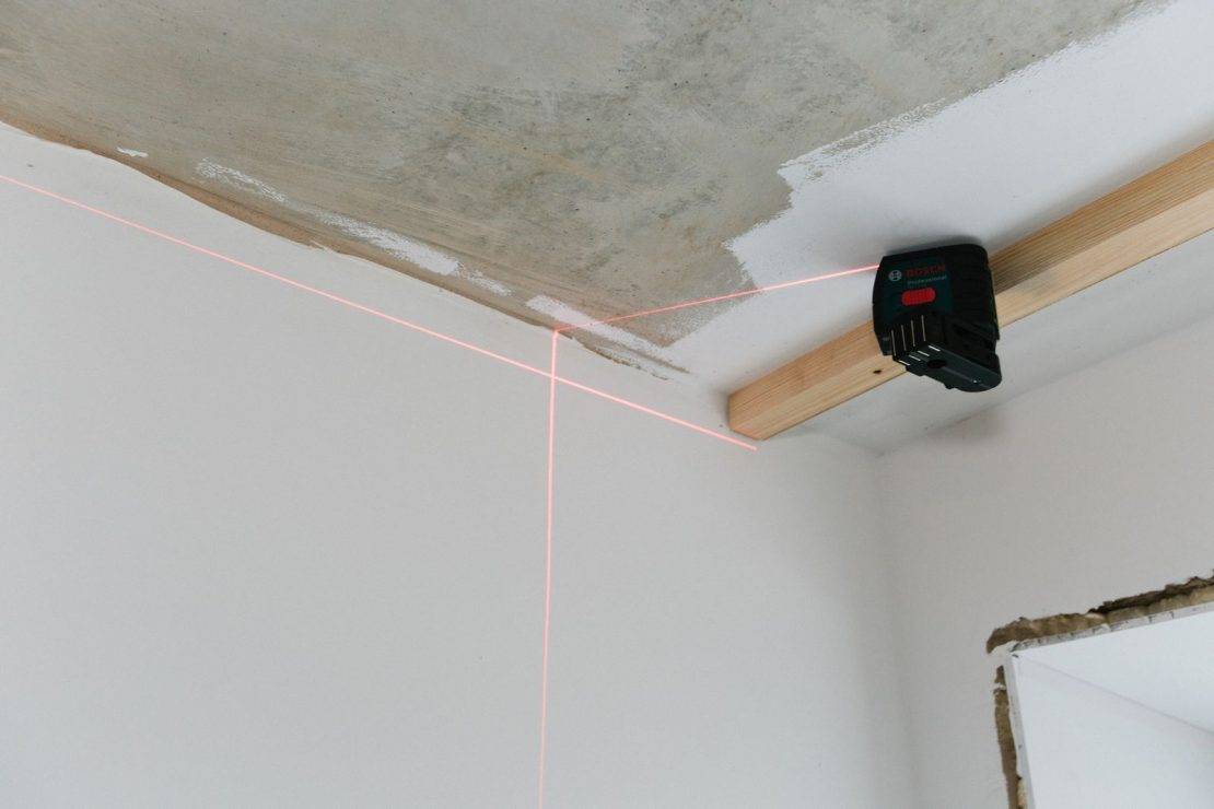 От неё проводят вертикали по стенам, пользуясь уровнем. Откладывают высоту короба. Расстояние отмеряют не от потолка (так как он чаще всего кривой), а при помощи лазерного нивелира с функцией «горизонт». Если такого нет, можно взять гидроуровень.