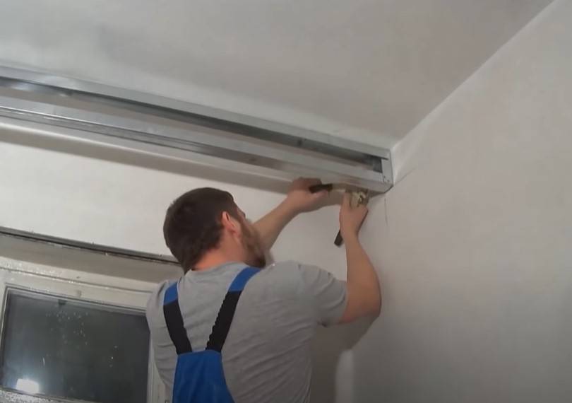 Сначала монтируют направляющую к потолку. Для этого используют анкер-клинья. Профиль прикладывают к перекрытию, сверлят отверстия и забивают крепёж. Подобным образом закрепляют и боковины каркаса к стенам.