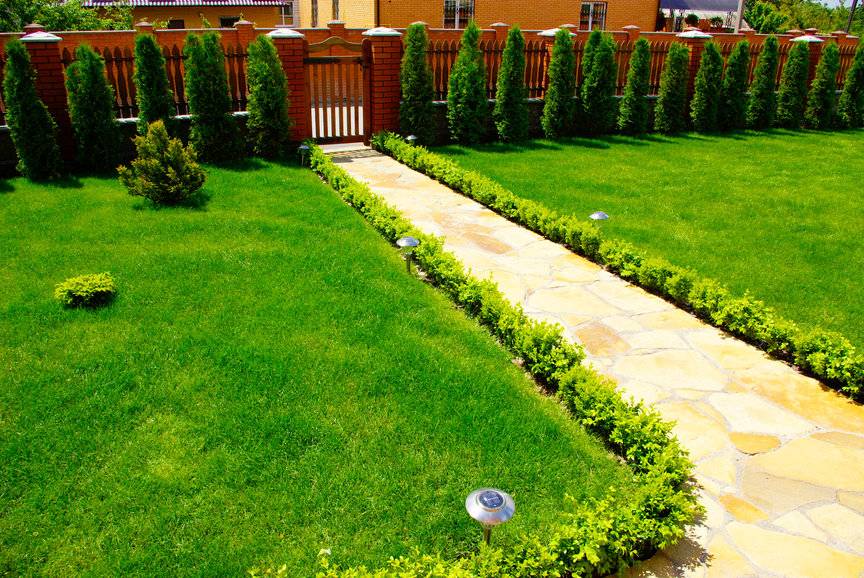 Зеленая изгородь, сформированная в виде невысокого бордюра, – оригинальное обрамление для клумб и дорожек