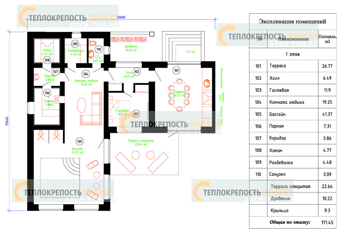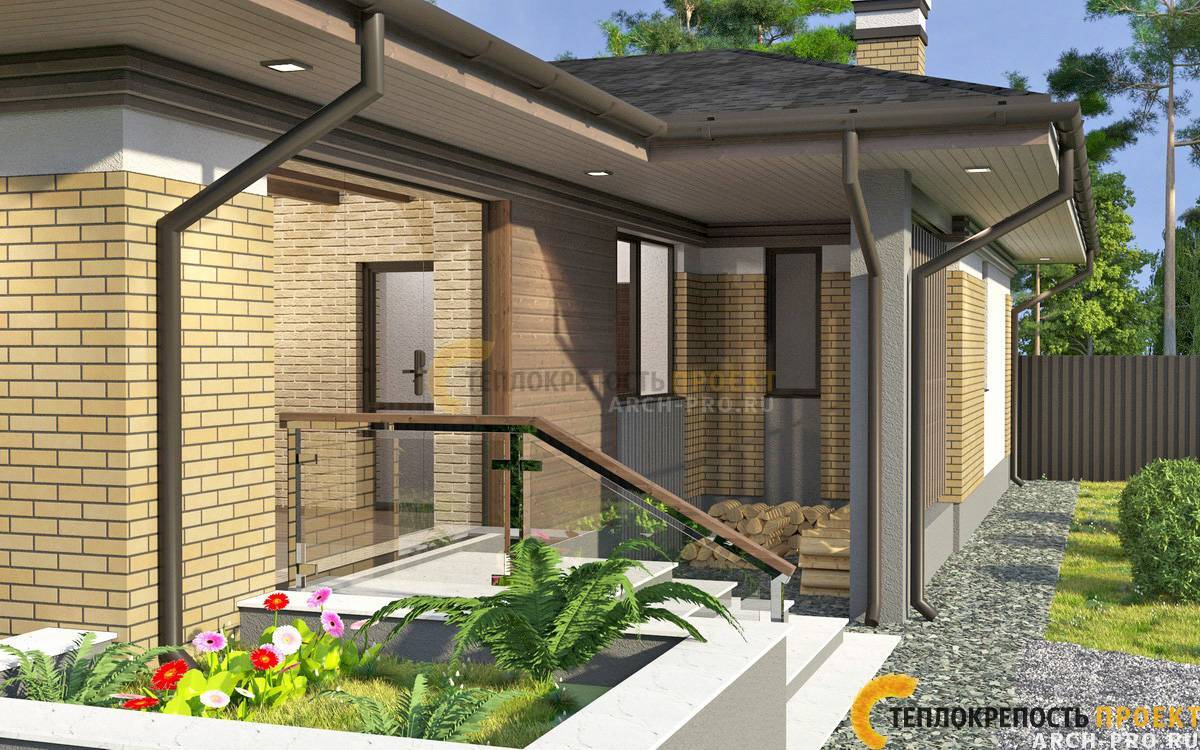 Выхода из дома три, и они проходят через крыльцо (6,2 м.кв.) , террасу (15,8 м.кв.) и котельную (7,3 м.кв.).