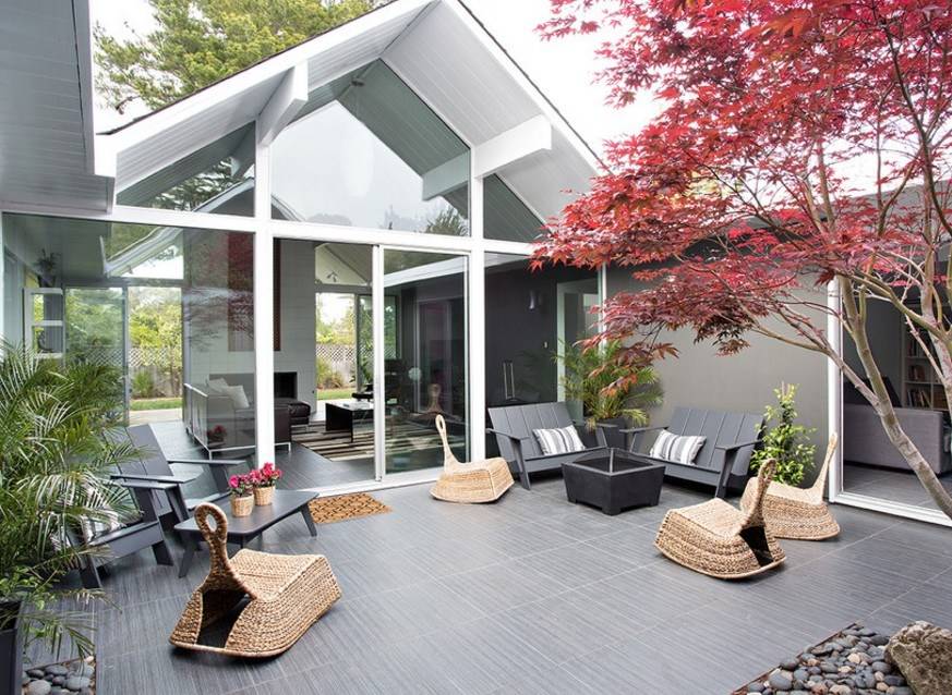 - во внутреннем дворике рекомендуется создать террасу или веранду, которая станет дополнительной зоной отдыха даже в плохую погоду;