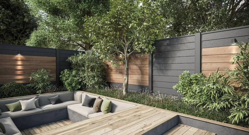 Деревянные заборы прекрасно сочетаются с металлическими деталями в стиле модерн. Это придаст теплому дереву необходимую долю холодности и эстетичности. Так же уберет излишнюю простоту, если она не нужна.