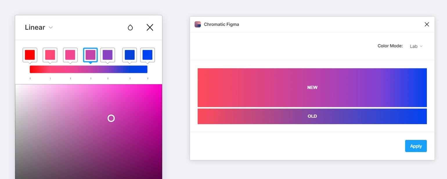 Если в качестве редактора вы используете Figma, то нужно установить плагин Chromatic Figma, который автоматически исправляет градиенты через LAB. Результат будет немного отличаться от инструмента Дэвида Джонстона.