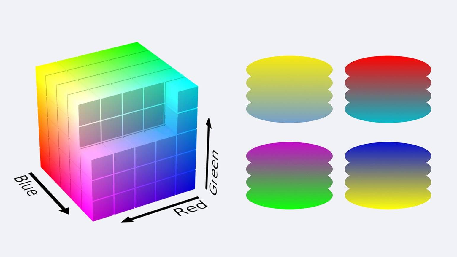 Расположение оттенков в кубическом пространстве RGB и примеры созданных в RGB градиентов. Изображение: Wikimedia Commons, Александр Кароза
