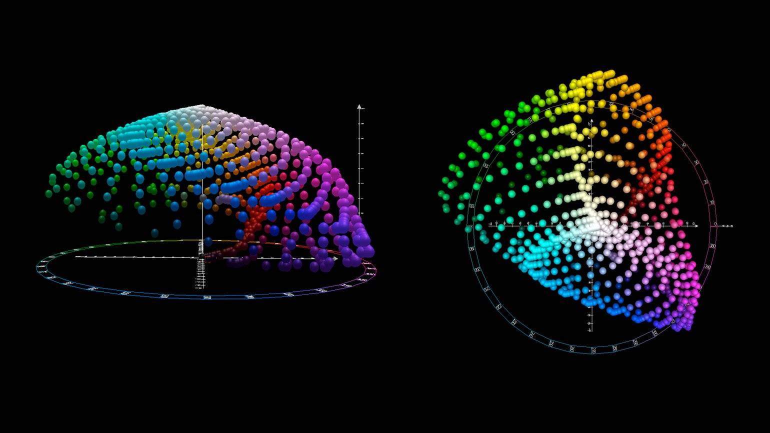 Трёхмерная визуализация пространства LAB: фронтальный вид и вид сверху. Изображение: Wikimedia Commons