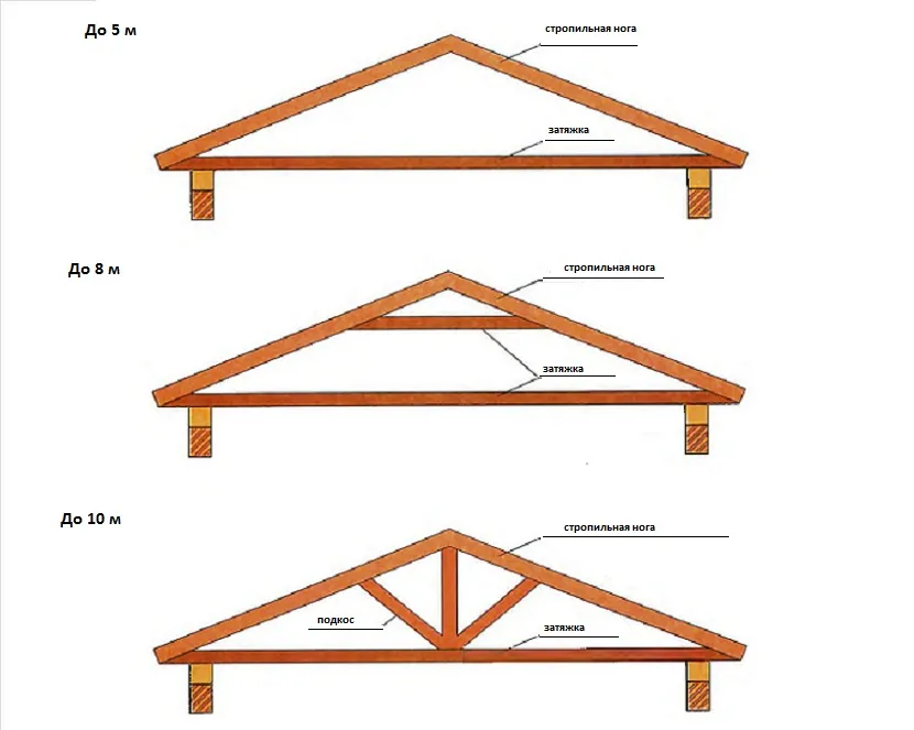 Дополнительная затяжка увеличивает пролёт до 8 метров, а упирающиеся в затяжку подкосы – до 10 метров Источник obustroeno.com
