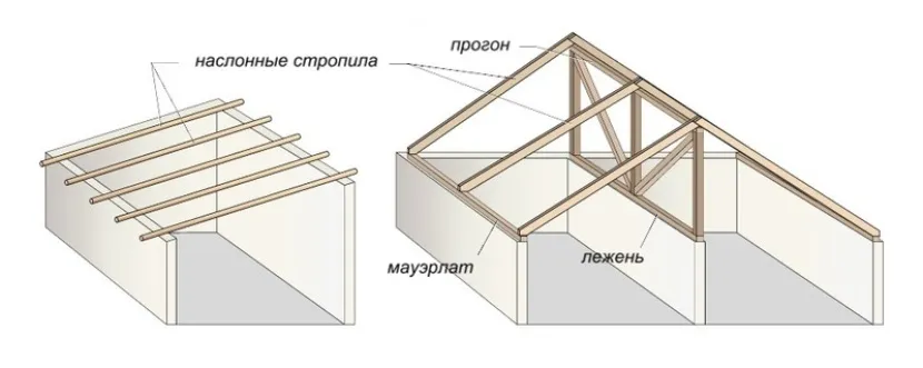 В составе конструкции есть одна плоскость ската, которая формируется самостоятельной системой стропил. Крайние части стропильных ног сооружаются на надёжных опорах, поэтому их относят к категории наслонных. Система стропил состоит из отдельных элементов, которые опираются концами на противоположные стенки постройки.