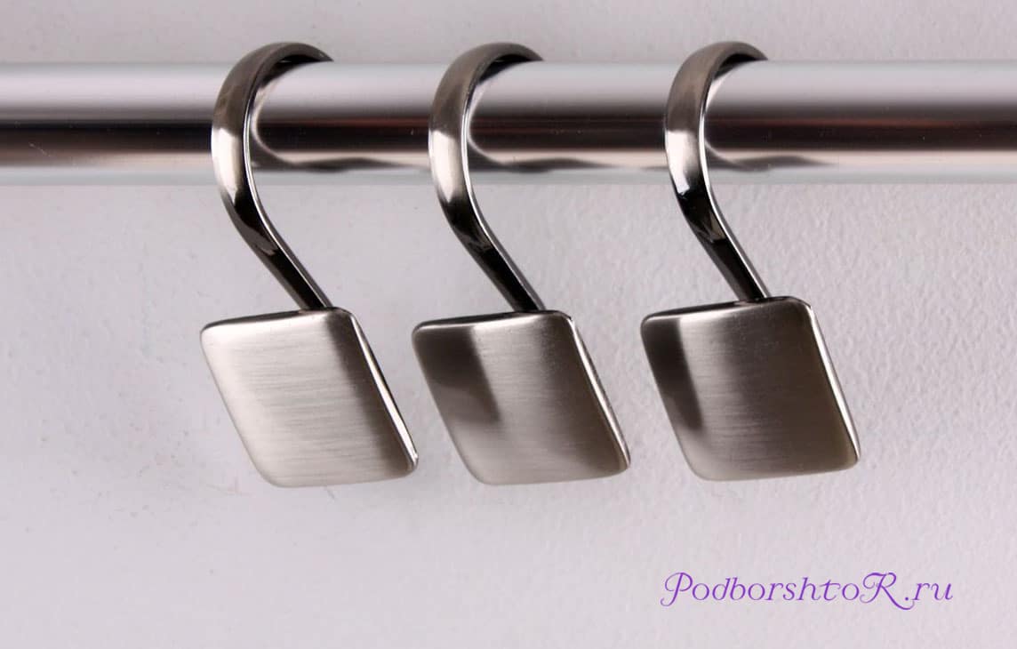 В случае, когда шторы собирают с помощью прихватов, возможен вариант с использованием изнаночных фиксаторов. Если применять крючки для штор в ванную, лучшим выбором считается пластик, не подверженный коррозии и не боящийся воздействия влаги.