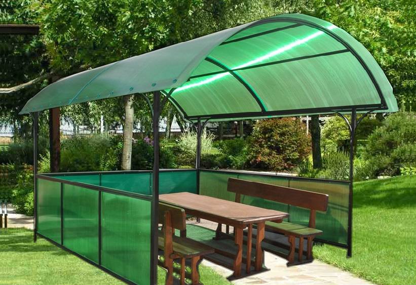Строительства любой постройки заканчивается настилом кровельного материала. Крыша беседки из поликарбоната стоит не дорого, обеспечивает хорошее освещение, отвод дождевой воды и снега. Этот материал является хорошим шумо- и теплоизолятором, простой в транспортировке и обработке. Владельцев загородных участков привлекает возможность создать крышу любой конструкции по доступной цене.